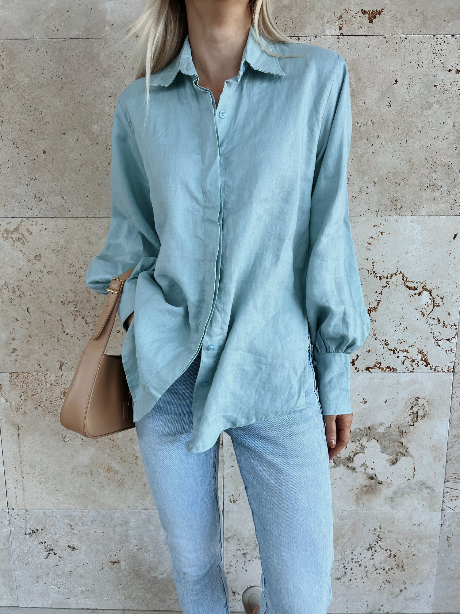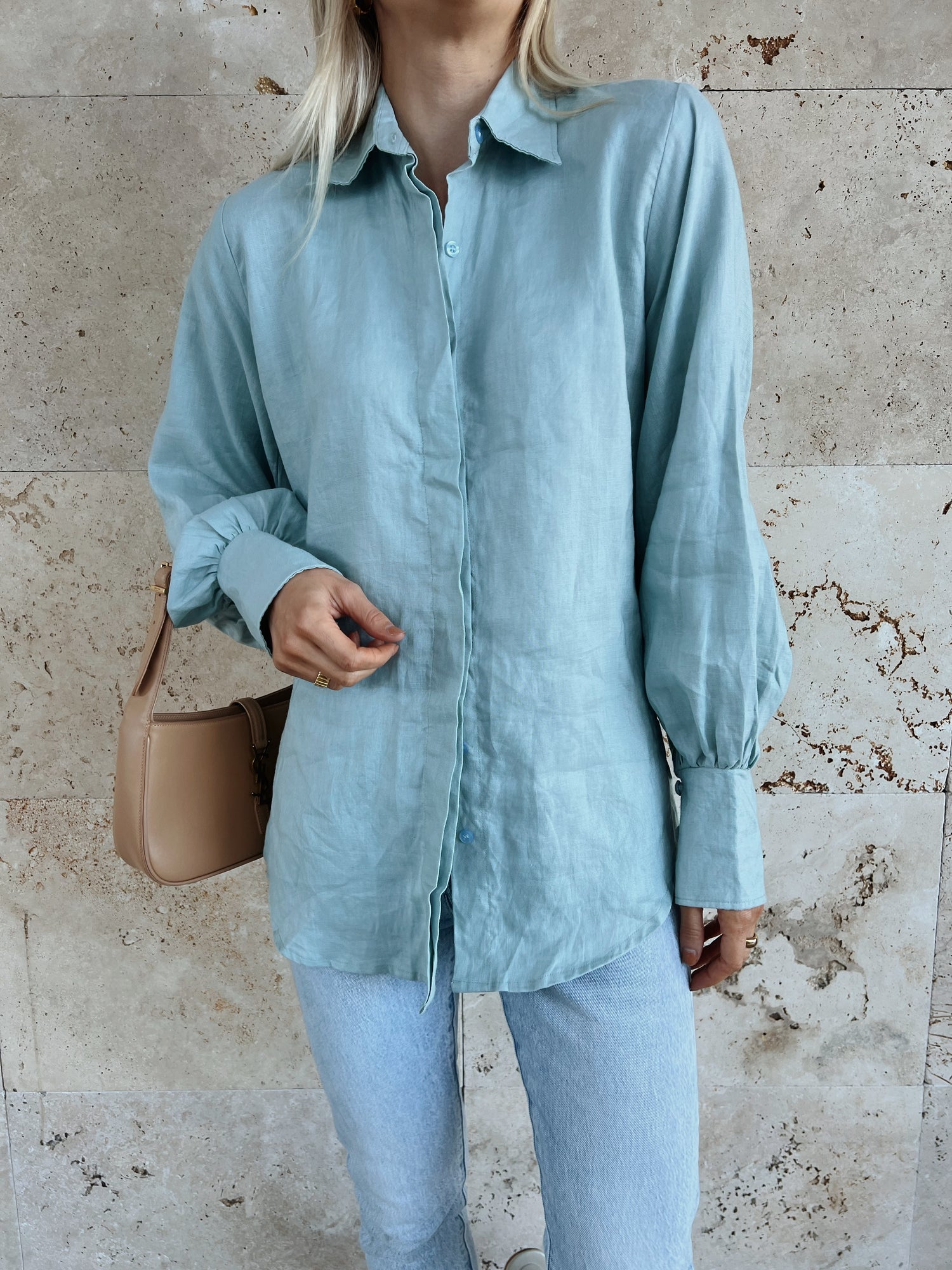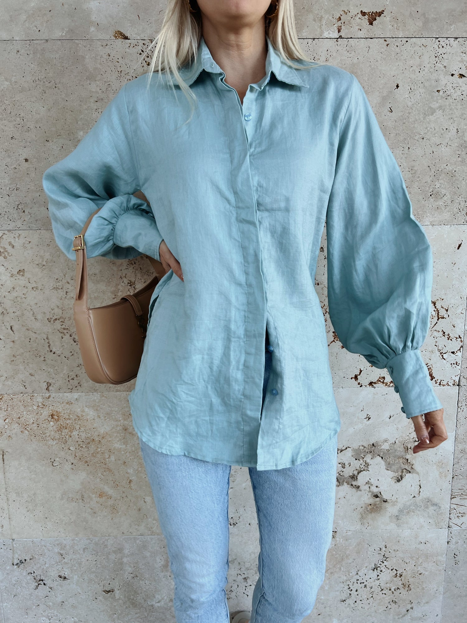 The Sally Top is made from 100% linen and features a collar, button-down front and buttoned cuffs