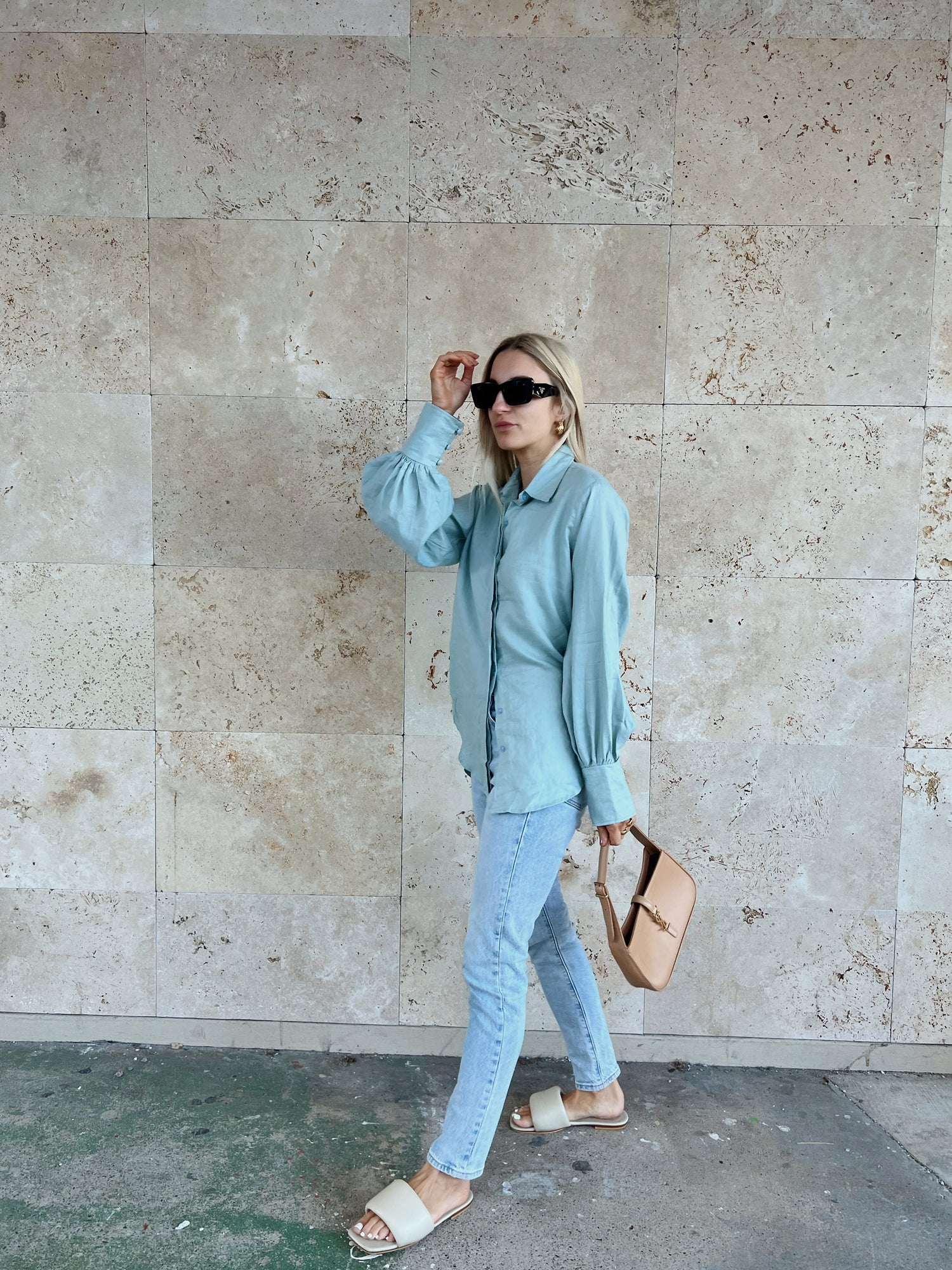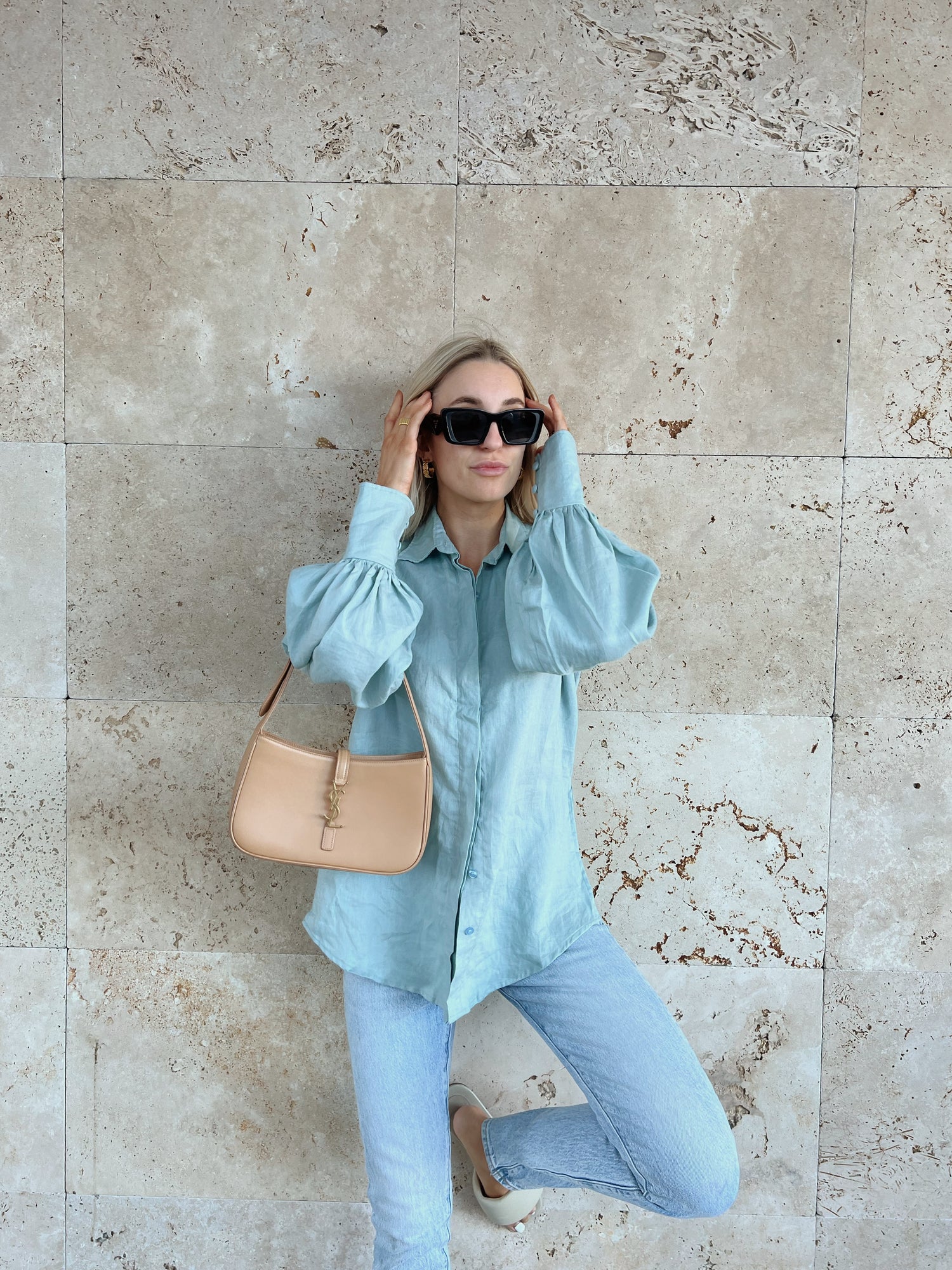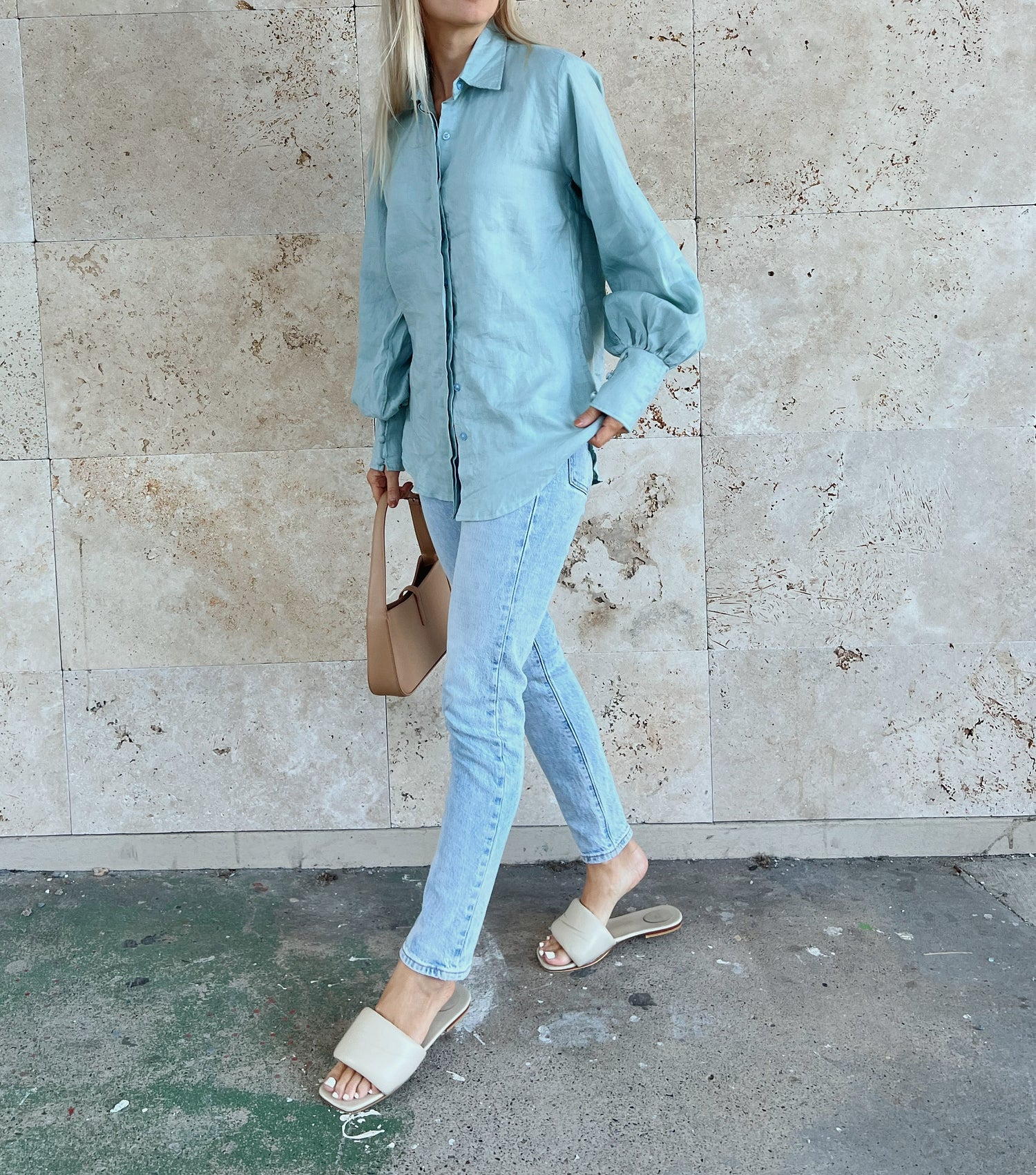 The Sally Top is made from 100% linen and features a collar, button-down front and buttoned cuffs