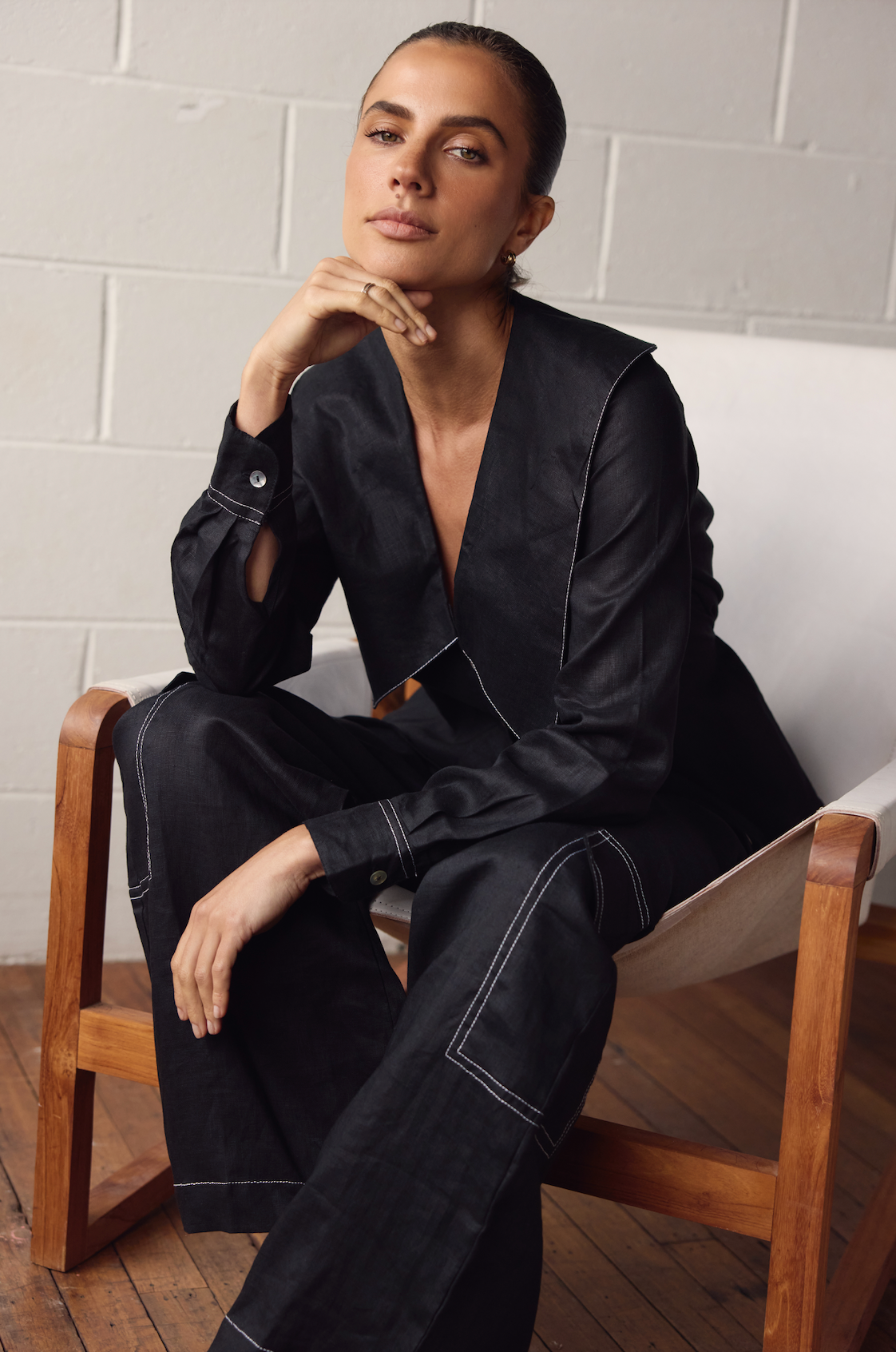The Matilda Shirt is based on our bestselling Blair Shirt - featuring an oversized collar and buttoned down front plus two side ties to secure around the back, bringing in the waist, finished with a contrast stitch.