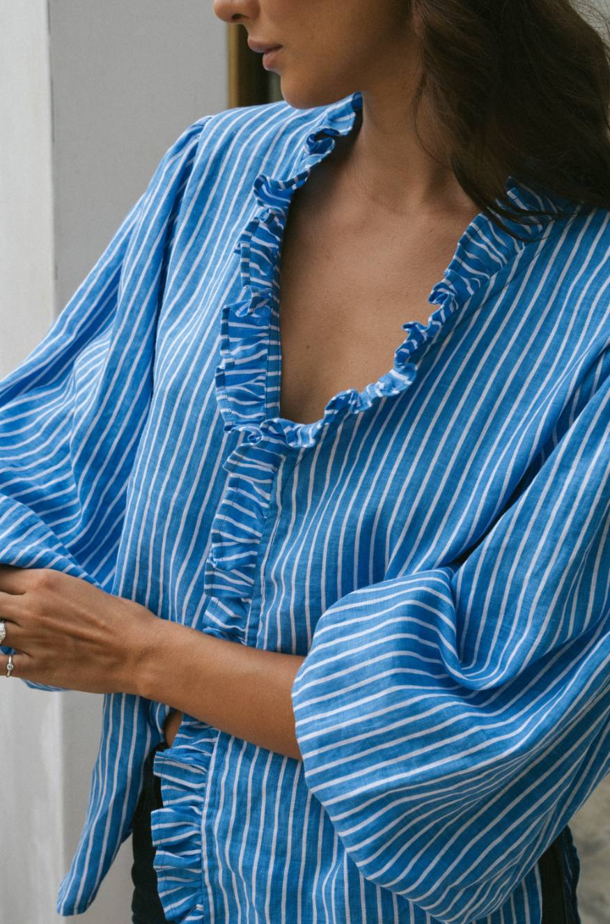 The ruffle Olive shirt available in our stunning ocean blue stripe features a full buttoned down front and balloon sleeves for that statement wardrobe piece.