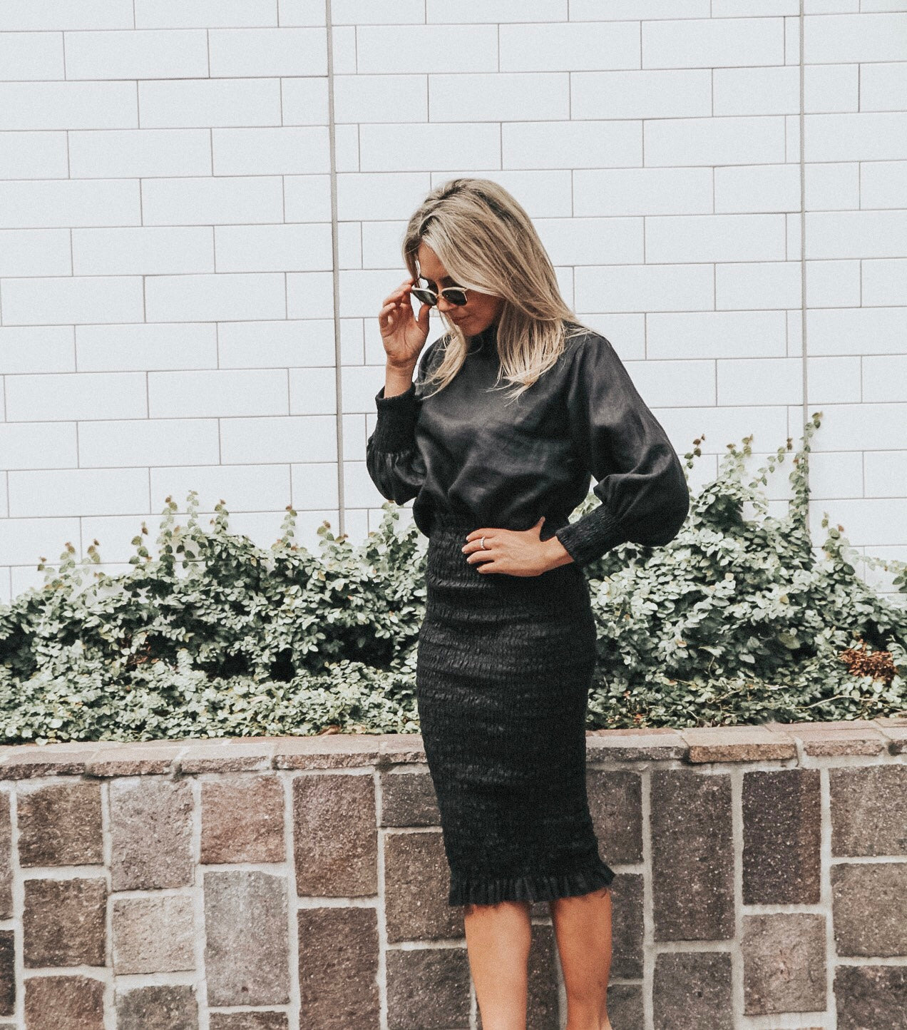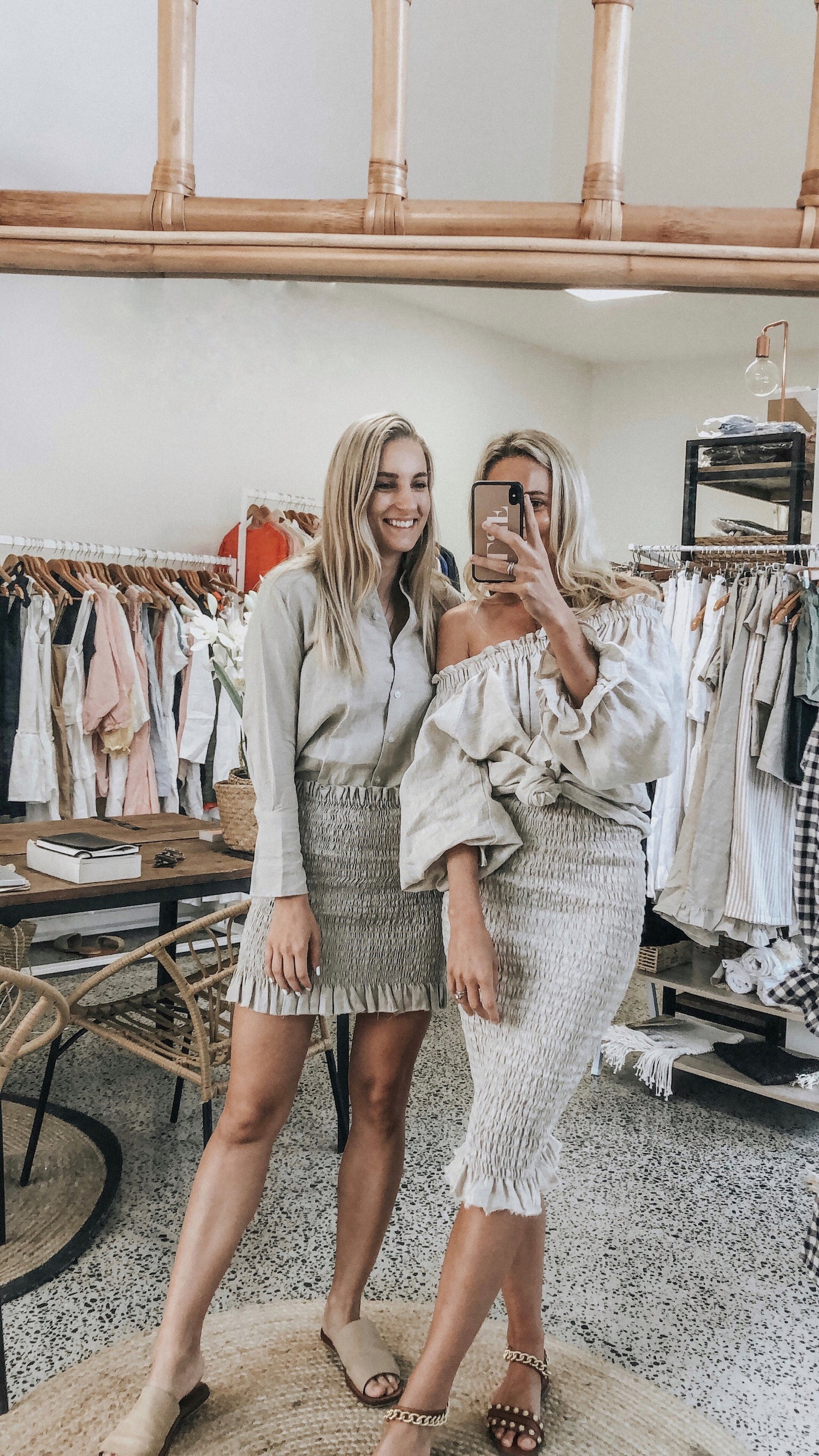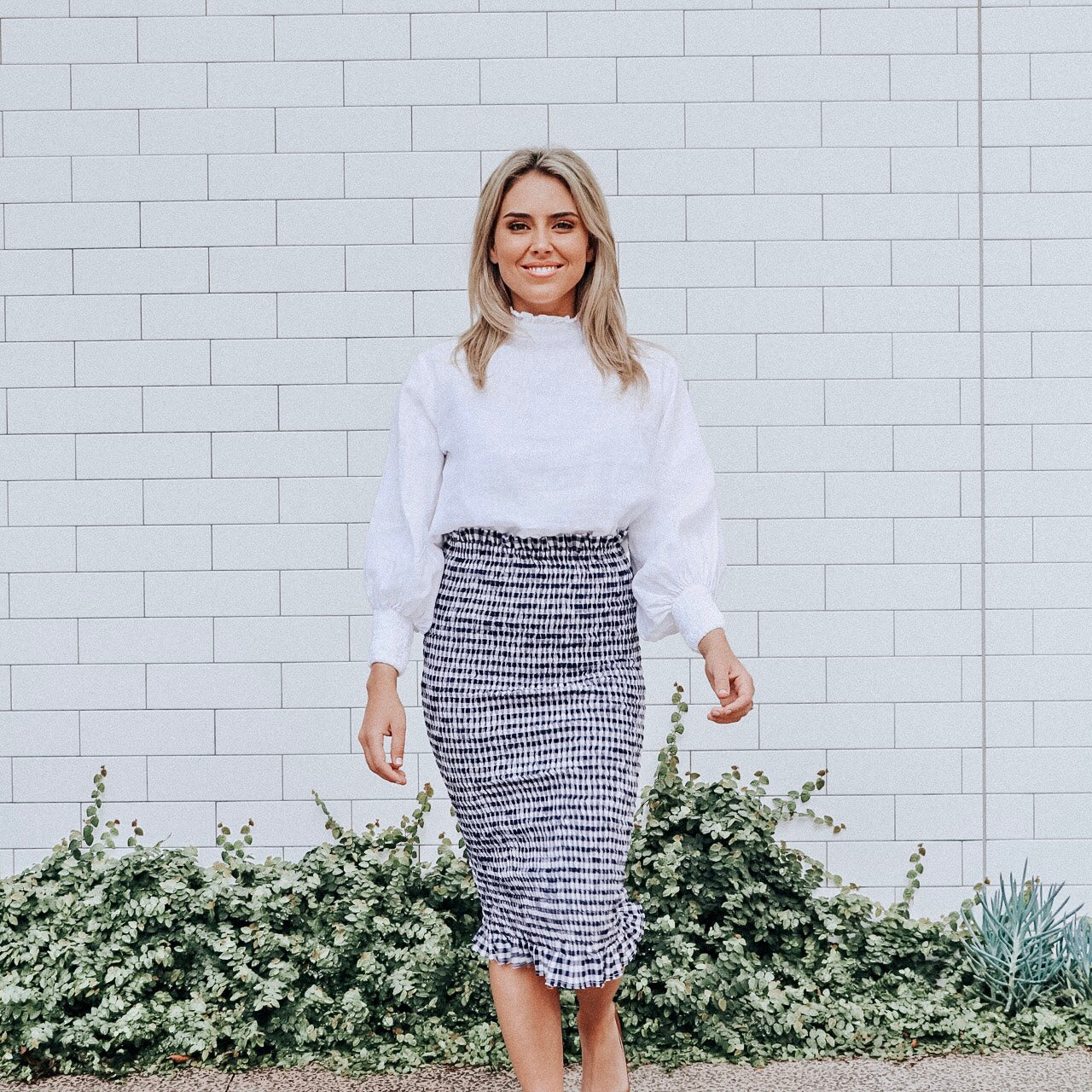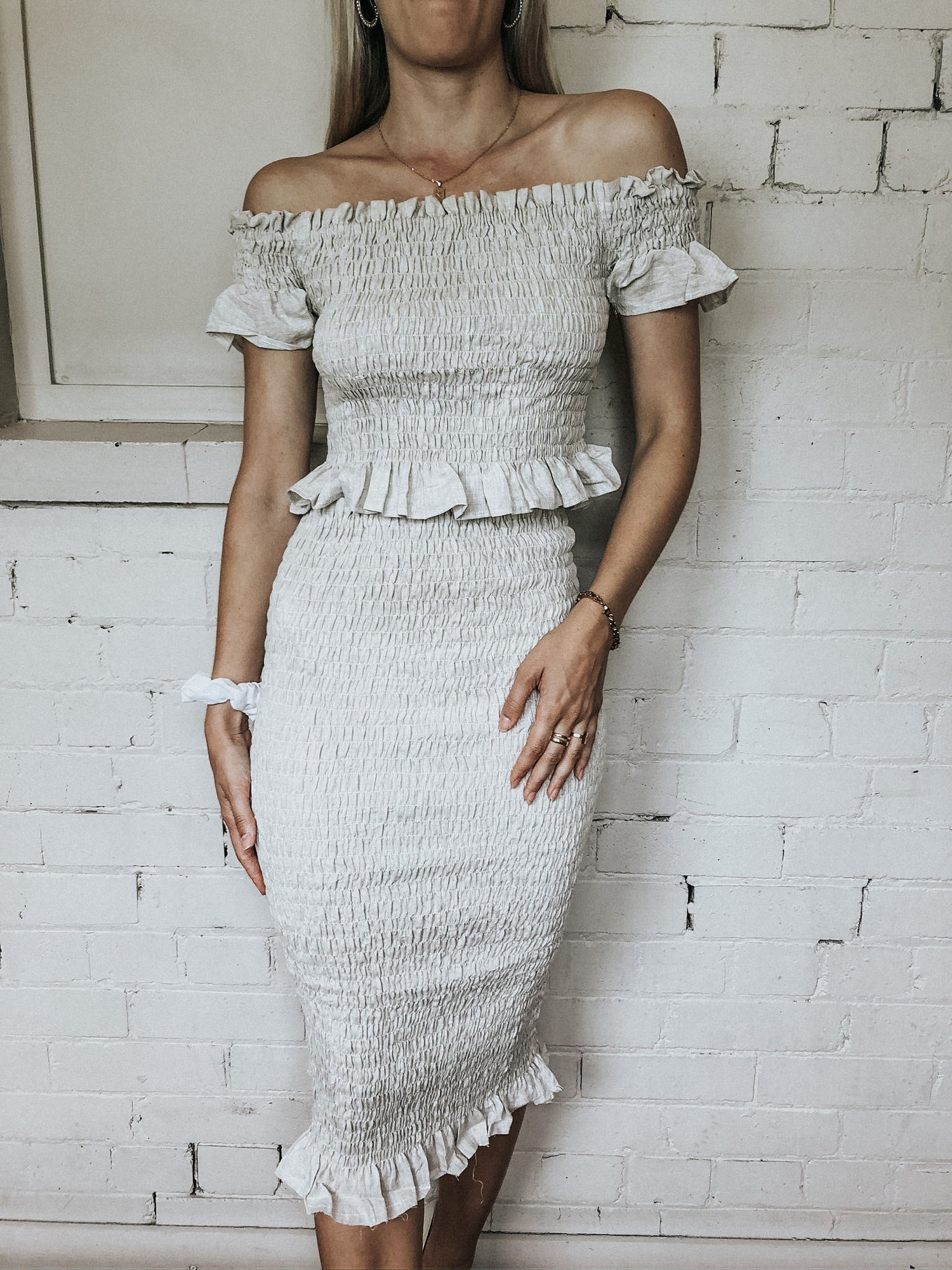 The Bonnie Skirt is a long shirred, fitted linen skirt with raw edged ruffle detail which can also be worn as a dress.