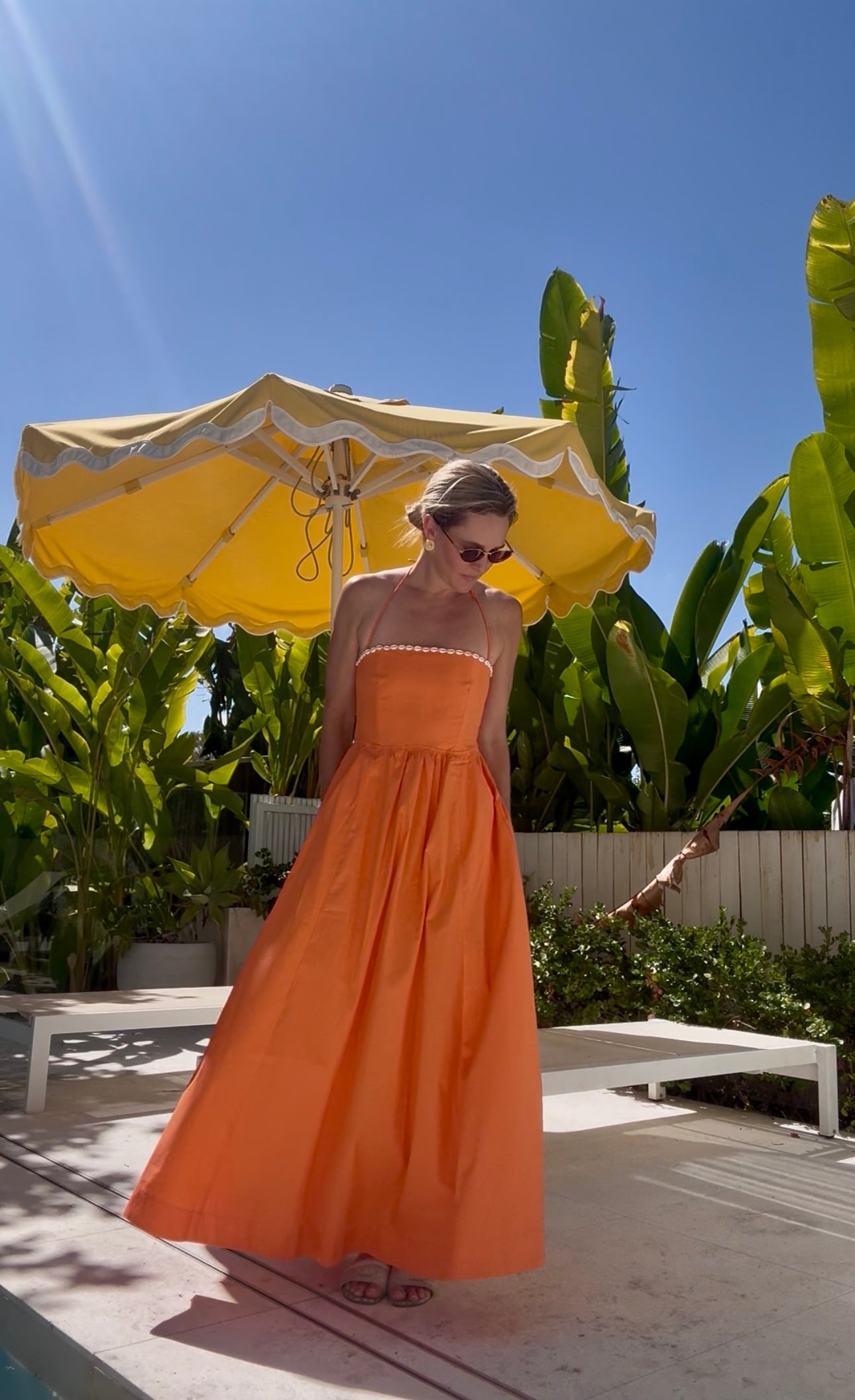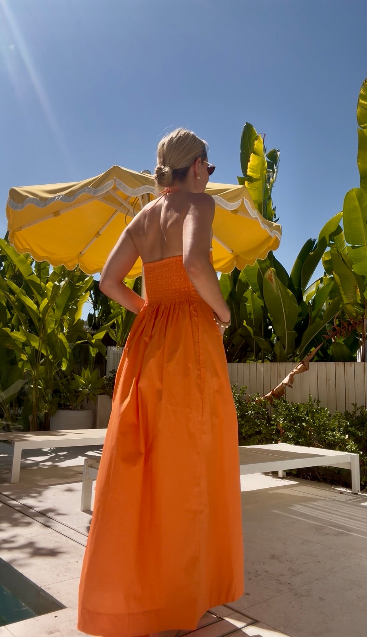 This exquisite piece features hand-stitched cowrie shell trim along the bust, adding a touch of coastal charm. With its versatile spaghetti straps, you can style it as a halter, on-the-shoulder, or strapless. The cinched waist and shirred back ensure a comfortable and flattering fit, while the side pockets add practicality to sophistication.